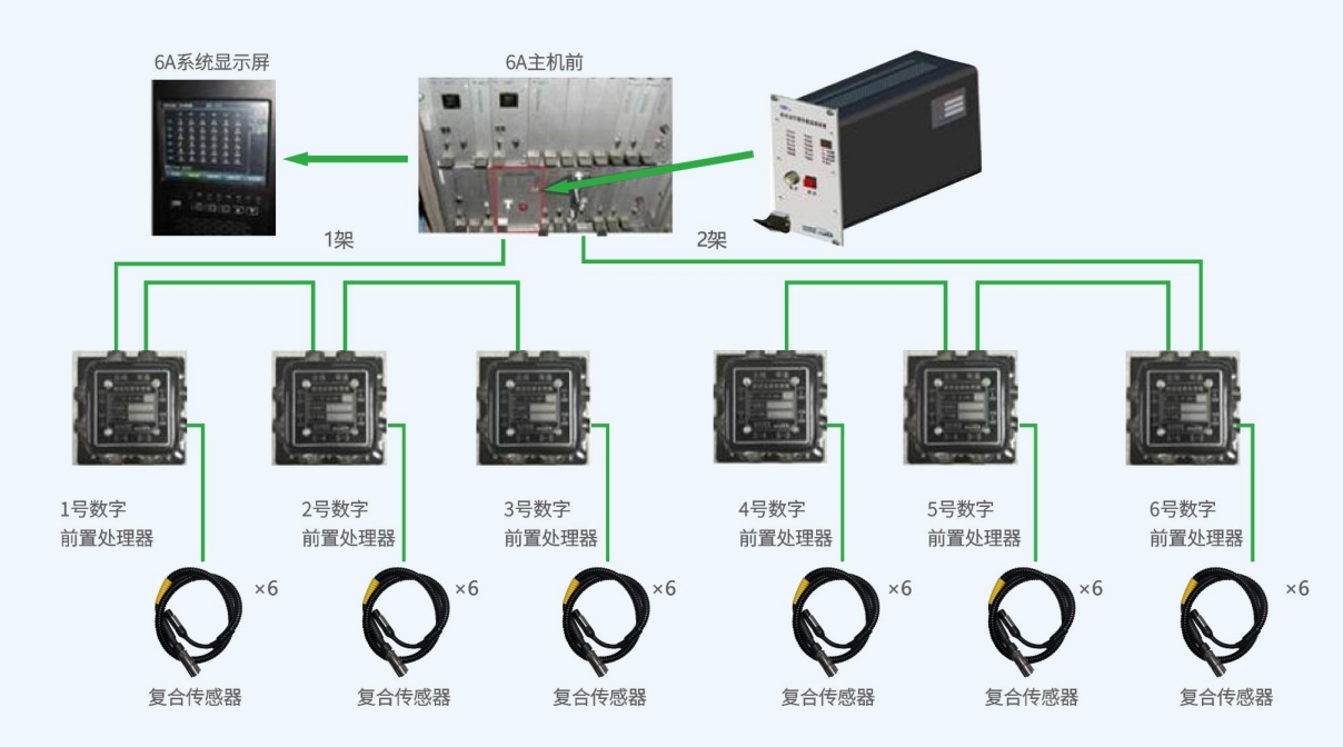走行部故障監(jiān)測(cè)系統(tǒng)(型號(hào)YZD-2)是為保證車輛運(yùn)行安全與品質(zhì)、評(píng)估部件健康狀態(tài)而研制的在線實(shí)時(shí)監(jiān)測(cè)裝置。相比軸溫監(jiān)測(cè)系統(tǒng),該系統(tǒng)采用溫度、振動(dòng)和沖擊監(jiān)測(cè)相結(jié)合的多參數(shù)診斷機(jī)制及專家系統(tǒng),可在故障早期發(fā)現(xiàn)部件異常,提高運(yùn)營(yíng)安全性、及時(shí)檢修改善部件運(yùn)行環(huán)境、延長(zhǎng)部件使用壽命、減少運(yùn)營(yíng)成本。系統(tǒng)主要由車載主機(jī)、前置處理器及復(fù)合傳感器組成,整車結(jié)構(gòu)拓?fù)淙缦聢D示意。