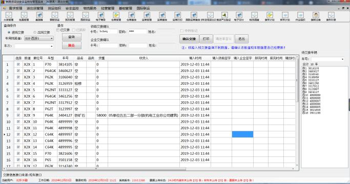 為加強(qiáng)專用線、專用鐵路貨物運(yùn)輸管理,進(jìn)一步提高專用線管理水平及貨運(yùn)服務(wù)質(zhì)量。我公司研發(fā)的專用線交接系統(tǒng),對(duì)進(jìn)出專用線車輛自動(dòng)識(shí)別車號(hào),保存車輛影像資料,機(jī)檢信息傳入貨運(yùn)站系統(tǒng),為路企交接提供依據(jù),并生成貨車調(diào)送單,避免了路企雙方對(duì)貨車延時(shí)占用費(fèi)的意見(jiàn)和分歧。可查詢專用線電子臺(tái)賬,同時(shí)采用無(wú)線手持機(jī)進(jìn)行數(shù)據(jù)時(shí)事跟蹤,及時(shí)辦理車輛進(jìn)出。